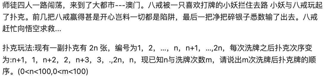 两个整数,第一个整数n,表示扑克牌的数量的一半,第二个整数m表示洗牌次数。