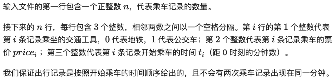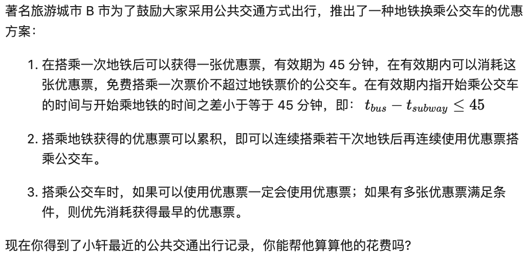 第四条记录,在第 96 分钟乘坐公交车,由于距离第三条记录中乘坐地铁已超过 45 分钟,所以优惠票已失效,花费 3 元乘坐公交车。